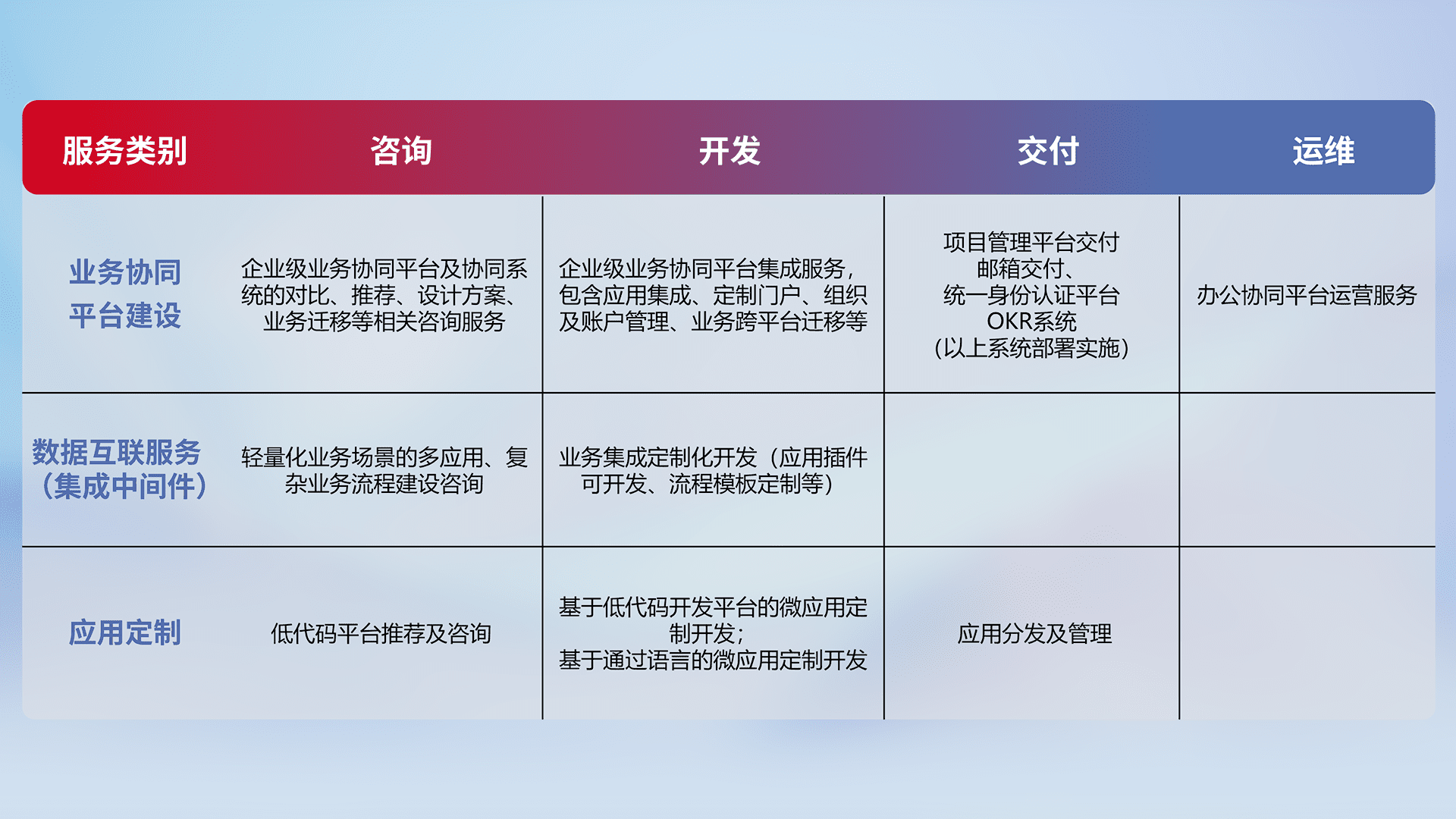 针对钉钉、、企微、、、IDaas等平台级产品提供产品的规划、、、方案、、交付、、、定制化开发等服务,,实现如统一协同办公、、智能客户服务、、混合会议管理、、、、智能数据查询、、、、等业务场景,,,,实现数字化转型。。。